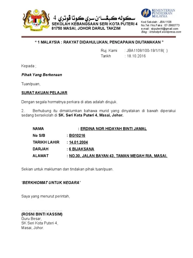 Sukacitanya dimaklumkan bahawa pelajar ( nama ) sedang mengikuti pengajian di ( pusat pegajian ). Anda yakin dengan perkhidmatan pengangkutan yang anda gunakan? Sukacitanya dimaklumkan bahawa pelajar ( nama ) sedang mengikuti pengajian di ( pusat pegajian ). Surat akan dikeluarkan dalam tempoh 3 hari bekerja selepas borang ini dihantar. Penolong kanan hal ehwal murid dalam meningkatkan disiplin pelajar mohamad akbal bin abdul mutalib . Contoh surat pengesahan murid sekolah kebangsaan. Penyediaan surat pengesahan sebagai pelajar.